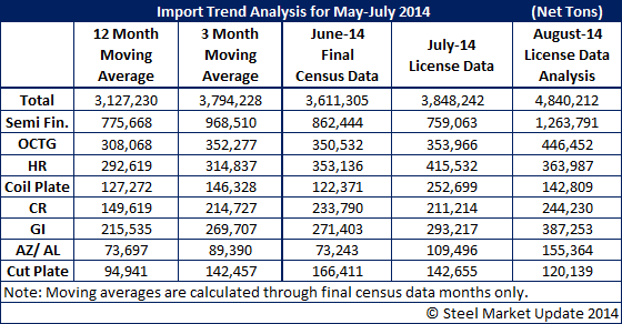 We have mentioned on numerous occasions that import license data can only be used as a barometer as to what the trend looks like. We recommend you read an excellent article on the subject which was produced for Steel Market Update by David Phelps, former president of the American Institute for International Steel (AIIS). The article title is “The Steel Import Monitoring and Analysis System (SIMA)” and was reproduced on our blog on January 12, 2014.