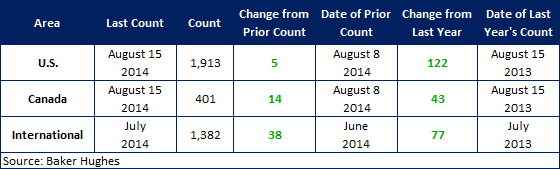 According to Baker Hughes data from August 15th, 2014, the U.S rig count for this week is 1,913 rigs exploring for or developing oil or natural gas. This count is an increase of 5 rigs when compared to last week, with oil rigs up 1 to 1,589 rigs, gas rigs up 5 to 321 rigs, and miscellaneous rigs down 1 to 3 rigs. Compared to last year the 1,913 count is an increase of 122 rigs, with oil rigs up by 192 gas rigs down by 67, and miscellaneous rigs down by 3.