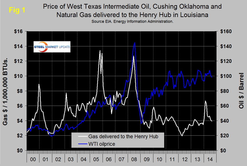 Figure 1 shows historical gas and oil prices since January 2000. The daily spot price of West Texas Intermediate fell below $100 in August and was $98.09 on August 11th, the latest daily figure available from the EIA. Brent closed at $103.47 on the same day. Natural gas delivered to the Henry Hub in Louisiana fell below $4.00 in August and on the 8th and closed at $3.92 / million BTUs. After the cold weather spike in February, Natural Gas has declined to a level 17 percent higher than it was in August last year. The EIA reported as follows at the close of July results: “The market’s perception of reduced risk to Iraqi oil exports and news regarding increasing Libyan oil exports contributed to a drop in the Brent crude oil spot price to an average of $107 per barrel (bbl) in July, $5/bbl lower than the June average. EIA projects Brent crude oil prices to average $107/bbl over the second half of 2014 and $105/bbl in 2015. West Texas Intermediate (WTI) crude oil prices fell from an average of $106/bbl in June to $104/bbl in July, despite record levels of U.S. demand for crude oil. The WTI discount to Brent, which averaged $11/bbl in 2013, is expected to average $8/bbl and $9/bbl in 2014 and 2015, respectively, both $1/bbl lower than projected last month. Natural gas spot prices fell from $4.47/million British thermal units (MMBtu) at the beginning of July to $3.78/MMBtu at the end of the month as natural gas stock builds continued to outpace historical norms. Natural gas working inventories on August 1 totaled 2.39 trillion cubic feet, tcf) 18 percent below the level at the same time a year ago. Projected natural gas working inventories reach 3.46 tcf at the end of October, 0.35 tcf below the level at the same time last year. EIA expects that the Henry Hub natural gas spot price, which averaged $3.73 per MMBtu in 2013, will average $4.46/MMBtu in 2014 and $4.00/MMBtu in 2015, $0.31/MMBtu and $0.51/MMBtu lower than in last month’s STEO, respectively.