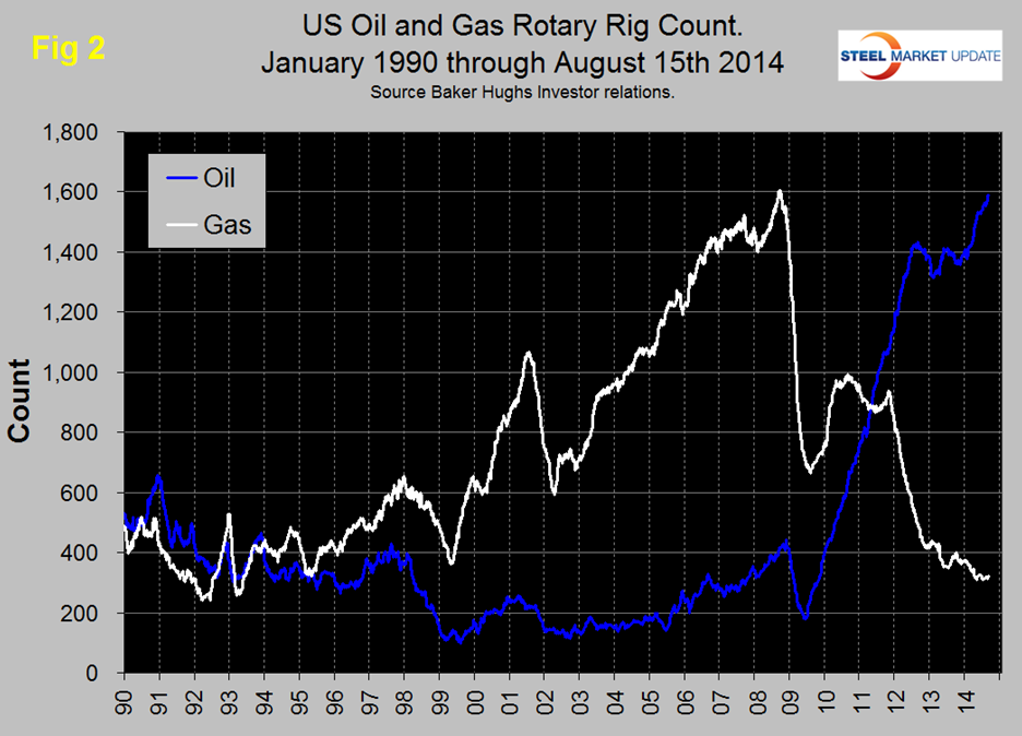 Figure 2 shows the Baker Hughes North American Rotary Rig Count which is a weekly census of the number of drilling rigs actively exploring for or developing oil or natural gas in the United States and Canada. Rigs are considered active from the time they break ground until the time they reach their target depth and may be establishing a new well or sidetracking an existing one. The Baker Hughes Rotary Rig count includes only those rigs that are significant consumers of oilfield services and supplies. Figure 2 shows that the oil rig count which had been trending flat for almost two years has continued to accelerate in 2014 and is now at the highest level in over 2 and a half decades. The gas rig count has trended flat since March and is at a level not seen since the mid-90s.