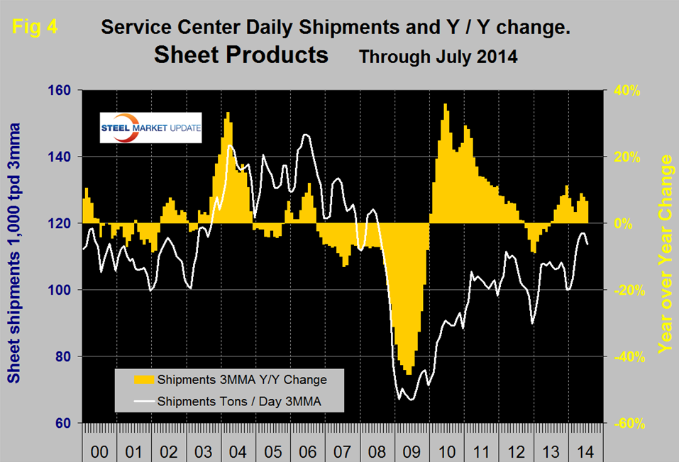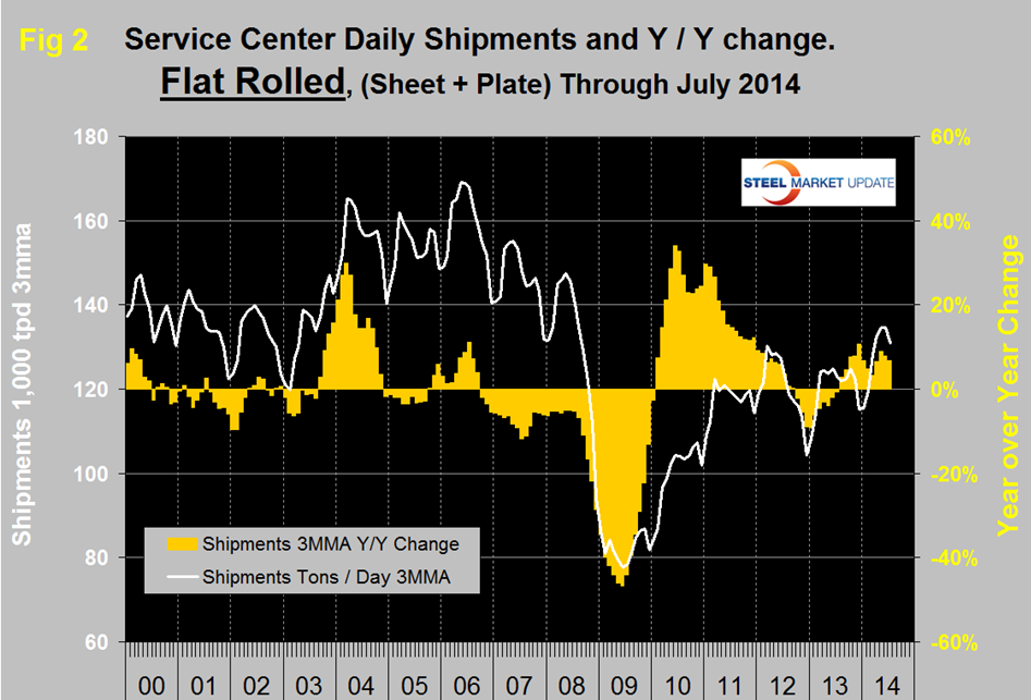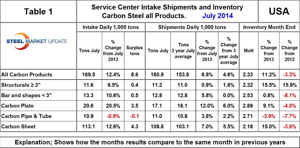 Table 1 shows the performance by product in July compared to the same month last year and also with the average t/d for July 2014, July 2013 and July 2012. We then calculate the percent change between July 2014 and July 2013 and with the 3 year July average. We hope this give the best view of market direction. Shipments of all products on a t/d basis were up by 6.8 percent from July last year and up by 4.6 percent from the average July shipments for 2014, 2013 and 2012. The fact that the single month comparison has a greater improvement than the three year comparison leads us to the conclusion that the improvement is accelerating. This is particularly true of plate and carbon bar. All products had positive shipment growth on both time comparisons but structurals continue to lag the others. Sheet products were up by 7.0 percent year over year and by 5.5 percent in the three year comparison.