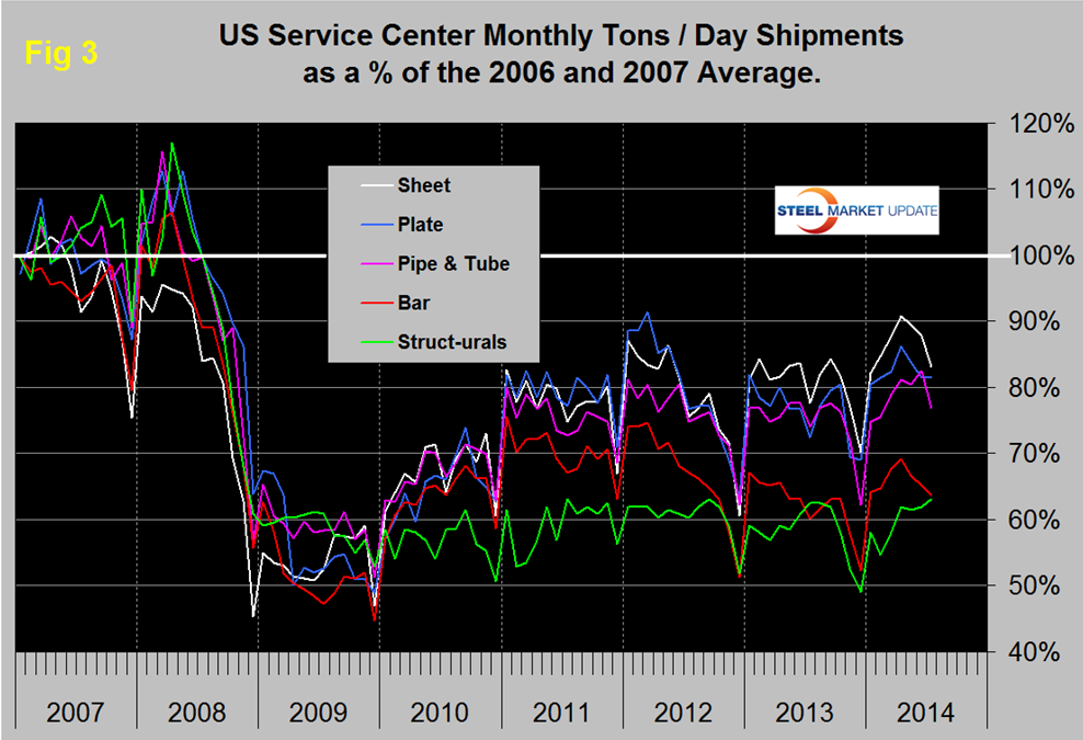 In 2006 and 2007, the mills and service centers were operating at maximum capacity. Figure 3 takes the shipments by product since that time frame and indexes them to the average for 2006 and 2007 in order to measure the extent to which service center shipments of each product have recovered. Again it can be seen that bar and structurals have the worst record. Sheet has had the best recovery overall but the July doldrums are obvious. The total of carbon steel products is now at 75.8 percent of the shipping rate that existed in 2006 and 2007, ranging from sheet products at 83.1 percent to structurals at 63.1 percent. The recovery of the service center sector has been much slower than has been experienced by the mills. Presumably this is because in a relatively lack luster market, more buyers are buying mill direct and this is probably particularly true of long products. In addition long products being more construction oriented are suffering from the slow recovery of that business sector.