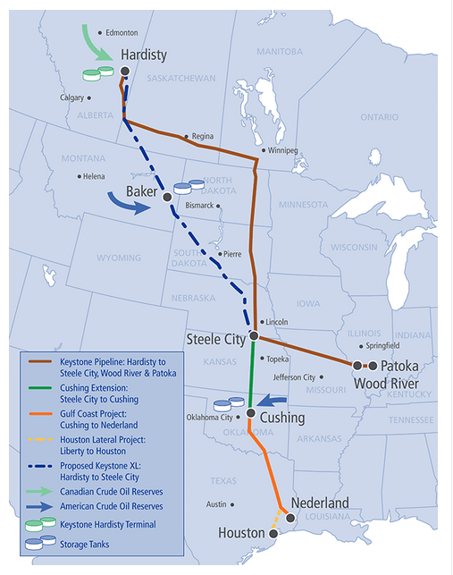 With respect to the three other sections of the Keystone Pipeline System; The Keystone Pipeline System is a 2,639-mile (4,247-kilometre) pipeline system that transports crude oil from Hardisty, Alta., to markets in the American Midwest and the U.S. Gulf Coast. The Canadian portion of the pipeline runs from Hardisty east into Manitoba where it turns south and crosses the border into North Dakota. From North Dakota, the pipeline runs south through South Dakota and Nebraska. At Steele City, Neb., one arm of the pipeline runs east through Missouri for deliveries into Wood River and Patoka, Illinois; another arm runs south through Oklahoma for deliveries into Cushing and continues south for deliveries into Port Arthur, Texas.