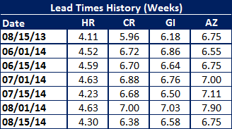 Galvanized also saw lead times drop from 7.03 weeks at the beginning of August down to 6.58 weeks this week.