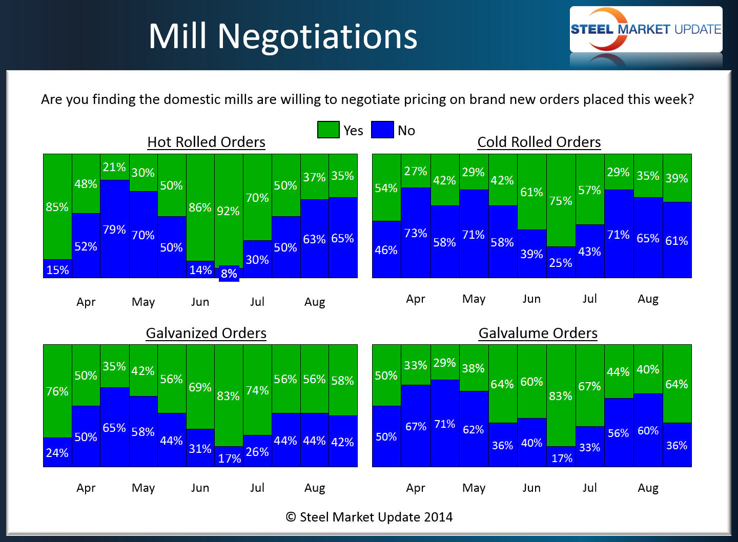 The largest movement we saw was on Galvalume where 64 percent of our respondents reported the mills as being willing to negotiate pricing this week. This is up from the 40 percent reported at the beginning of August.
