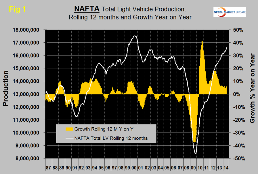 On a rolling 12 months basis year over year (y/y) light vehicle production in NAFTA increased by 5.9 percent and is now well above the pre-recession peak, (Figure 1).