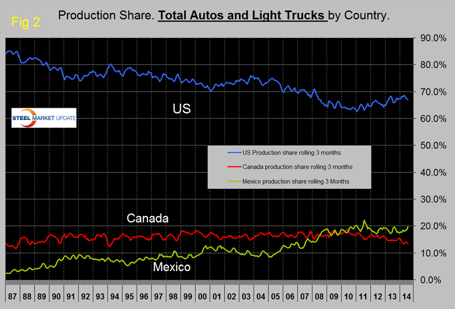 This decline has occurred every month so far in 2014 for NAFTA as a whole and ranges from positive 0.94 for the US to negative 7.8 percent for Canada with Mexico coming in at negative 3.4 percent. The production share trends for M&HTs is similar to light vehicles, (Figure 4).