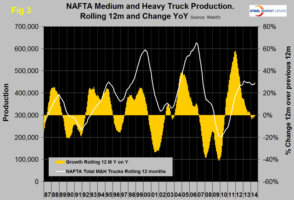 Medium and heavy truck production in NAFTA in July was 508,356 units SAAR, the best performance since January 2007. On a rolling 12 months basis production is still down year over year but the decline has been slowing and fell to 0.7 percent in 12 months through July, (Figure 3).