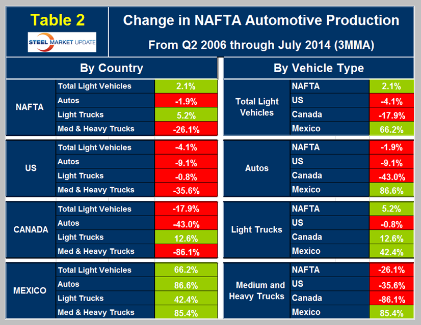 Total light vehicle production in NAFTA on a three month moving average basis is now 2.1 percent higher than it was in the pre-recessionary peak of Q2 2006, however there is a big difference between the recoveries of the three nations, (Table 2).