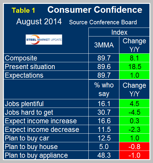On a year over year basis using a 3MMA the Composite is up by 8.1 lead by consumers view of the Present Situation which is up by 18.5, (Table 1). The employment sub-indexes, job availability and wage expectations, are improving. Intentions to buy both a house and an appliance became negative in May and continued to be negative in June, July and August, year over year. May was the first time in over a year that housing had been negative, intentions regarding appliances tend to be more erratic.