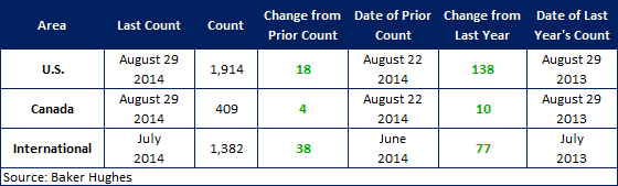 According to Baker Hughes data from August 29th 2014, the U.S rig count for this week is 1,914 rigs exploring for or developing oil or natural gas. This count is an increase of 18 rigs when compared to last week, with oil rigs up 11 to 1,575 rigs, gas rigs up 8 to 338 rigs, and miscellaneous rigs down 1 to 1 rig. Compared to last year the 1,914 count is an increase of 138 rigs, with oil rigs up by 187 gas rigs down by 42, and miscellaneous rigs down by 7.