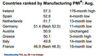 The Eurozone Manufacturing PMI came in at 50.7 in August, down from 51.8 in July and below the flash estimate of 50.8. Rates of expansion slowed throughout the region with the exception of Ireland. Economic and geopolitical reasons were cited for slower demand and weaker export business. Input prices increased at slightly lower rate than July while output charges were stagnant. Manufacturing slowdowns in France and Italy were of particular concern. Markit suggests the PMI numbers, and the upcoming PMI for the service industry, may prompt additional monetary or fiscal stimulus.