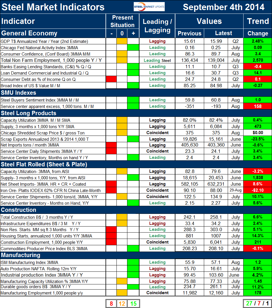 There were no changes in the present situation of the long products indicators. Net imports and service center shipments continue to be unsatisfactory by historical standards. In the flat rolled section “supply” was changed from neutral to positive in recognition that monthly tonnage is now back to where it was before the recession. Net imports of sheet products continue to surge and are now up by 100 percent since late 2011. The price of iron ore fell to $88 on August 29th and has since fallen further resulting in a re-classification from neutral to negative. A high iron ore price is indicative of a strong global market, the reverse suggests that tonnage will increasingly be crossing the oceans looking for a home on our shores.