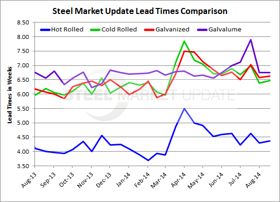 Galvalume lead times remained at 6.75 weeks which was where they were reported to be during the middle of August. They are shorter than the 7.90 weeks reported at the beginning of August of this year. One year ago Galvalume lead times were measured as averaging 6.55 weeks.