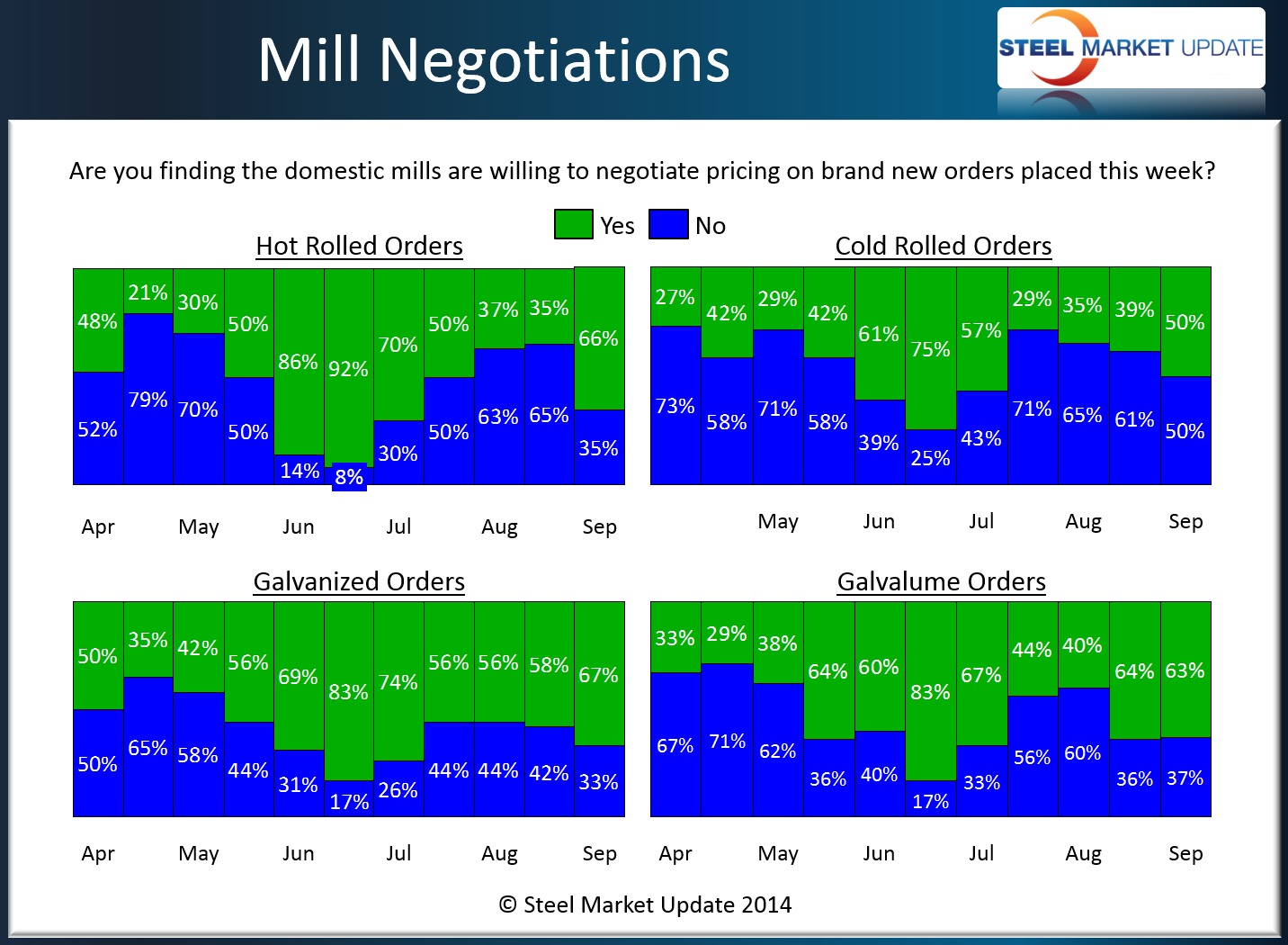 We saw modest growth in the percentages reporting cold rolled as negotiable. In the most recent survey, we found 50 percent of our respondents reporting the mills as now willing to negotiate spot CR pricing. This is up from the 39 percent measured during the middle of August.