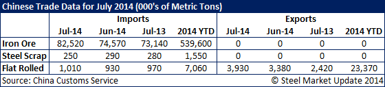 Chinese steel trade data was recently released for the month of July 2014, providing updated data on iron ore imports, steel scrap imports, and flat rolled imports and exports. Chinese imports of iron ore in July were 82,520,000 metric tons, an increase of 10.7 percent from the previous month and an increase of 12.8 percent from July 2013. Total iron ore imports for 2014 were adjusted to 539,600,000 tons.