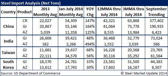 China averaged 20,867 net tons of galvanized exports to the U.S. during 2013. Their three month moving average (May, June, July 2014) is 73,778 net tons. Their biggest month this year was July at 84,852 net tons. September should come in greater than their previous high.