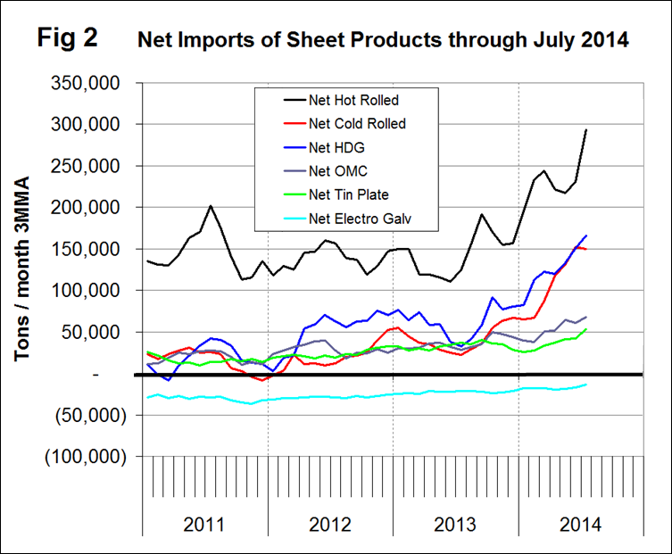 Net Imports of Sheet Products through July 2014