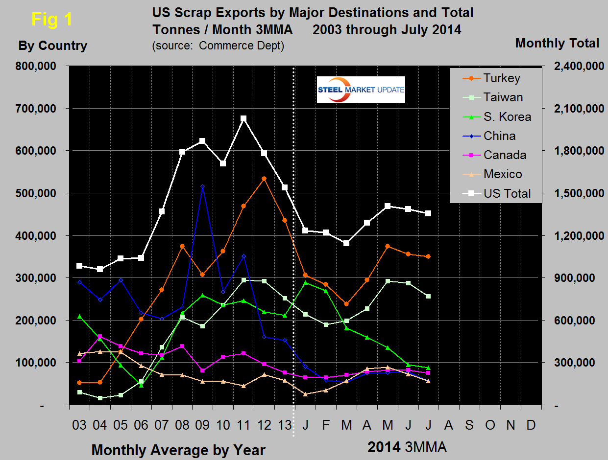 Figure 1 shows that the three month moving average, declined by 2.2 percent in July and continued to be lower than the average in any year from 2007 through 2013. The most obvious trend so far this year continues to be the decline in tonnage to South Korea, down by 69 percent since January. Korea booked three cargoes in the first week of July after weeks of refusing to meet offered prices. The July price was up $8 / tonne identical to the increase Thailand paid for a cargo of 80:20 #1 #2 heavy melt.