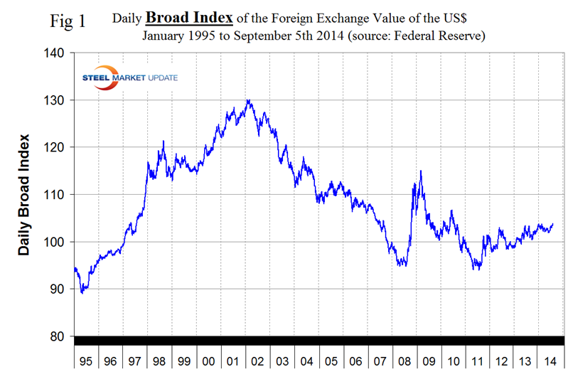 Based on the daily Federal Reserve Broad Index value of the US $ against our major trading partners we see a strengthening trend that has existed for the last three years. On February 3rd 2014, the value for the dollar was 103.8026. The index then weakened, turned around at mid-year and on September 4th had achieved the highest value of the year at 103.8562, (Fig 1).