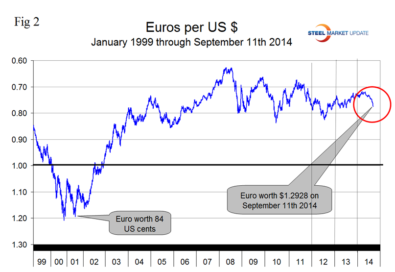 On September 6th the Euro broke through the 1.3 US $ / Euro level for the first time since July 11th last year and closed at 1.2928 on the 11th, (Fig 2).