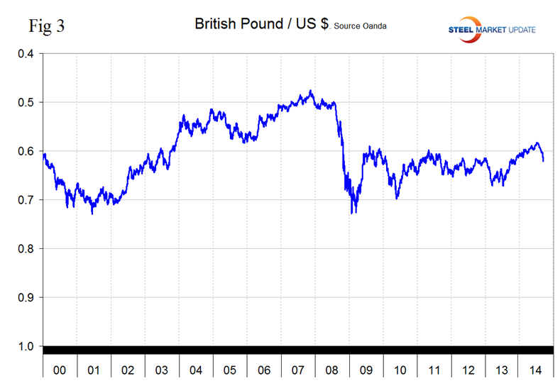 The abrupt decline in the British pound continued through the 11th in spite of comments by the Bank of England Governor Mark Carney suggesting that the central bank might start to raise interest rates in the spring. Scotland will vote for independence on September 18th. Until late August, investors had largely ruled out the chance of Scotland breaking away from the three-century-old union. But with recent polls indicating the vote is on a knife edge, hedge funds are scrambling to seek protection from further weakness in the pound, driving up volatility. Sterling was last at 0.6917 pounds to the US $, (Fig 3).