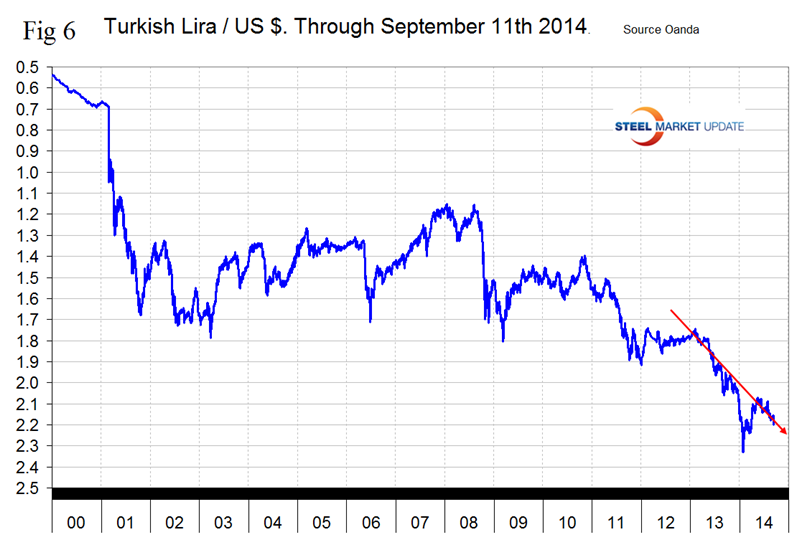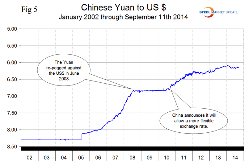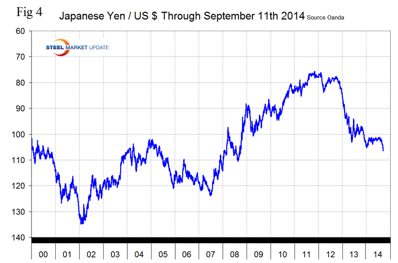 Japanese yen has had the greatest decline of all sixteen steel trading currencies in the last month falling by 4.2 percent to 106.53 yen to the $ on September 11th, (Fig 4). This is its lowest value in terms of US dollars since September 22nd 2008. It appears that the foreign exchange market led the rate move. Japanese investors have stepped up the export of their savings (they have purchased $12 billion of foreign bonds over the past two weeks), and at the same time, speculators have grown a substantial short yen position. The gross short speculative yen position in the futures market has grown by almost 50 percent to 133k contracts in the four weeks through September 2nd. The second round of yen weakness is now occurring catalyzed by the most recent release of Japanese economic data which was worse than expected. In Q2 the Japanese economy as measured by GDP shrank 7.1 percent due to a fall in both consumer spending and capital investments. Analysts believe that the longer Abe’s policies fail to deliver the hoped-for economic results, the more intensely they will be implemented and to expect more yen weakness over the coming year.