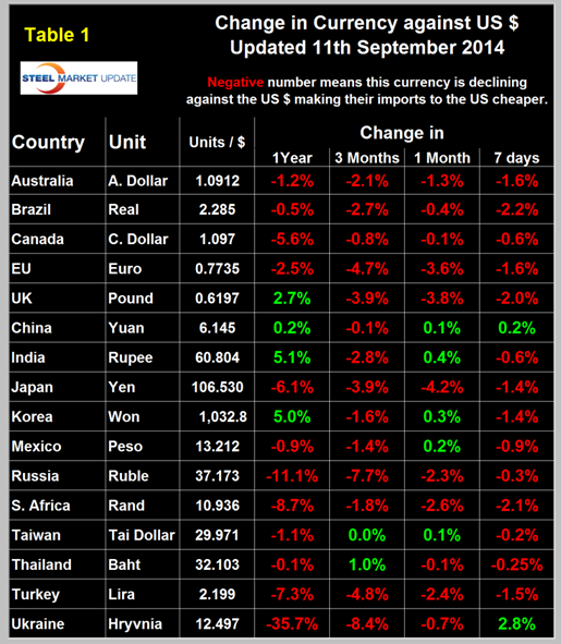 The Broad Index has strengthened by 1.1 percent in the last three months. It does not necessarily follow that the currencies of the steel trading nations follow the Broad Index but in the recent past this has been the case. Table 1 shows the number of currency units of steel trading nations that it takes to buy one US dollar and the change in one year, three months, one month and seven days. Negative values for change indicate that the dollar is strengthening against a particular currency. In the last three months and in 7 days through September 11th, the dollar has strengthened against 14 of the 16 currencies reviewed in this report. Table 1 is color coded to indicate strengthening of the dollar in red and weakening in green. We regard strengthening of the US Dollar as negative and weakening as positive because the effect on net imports.