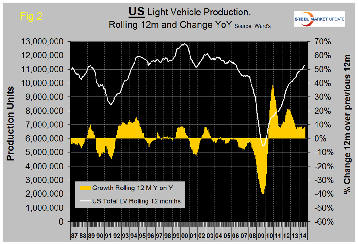 Figure 2 shows the production of light vehicles in the US and the growth rate on a 12 month rolling average basis. Growth has been fairly consistent for the last 15 months and has averaged 7.9% in that period. Production is now at a level not seen since July 2006. The mix of autos and light trucks in the US is now 38:62.