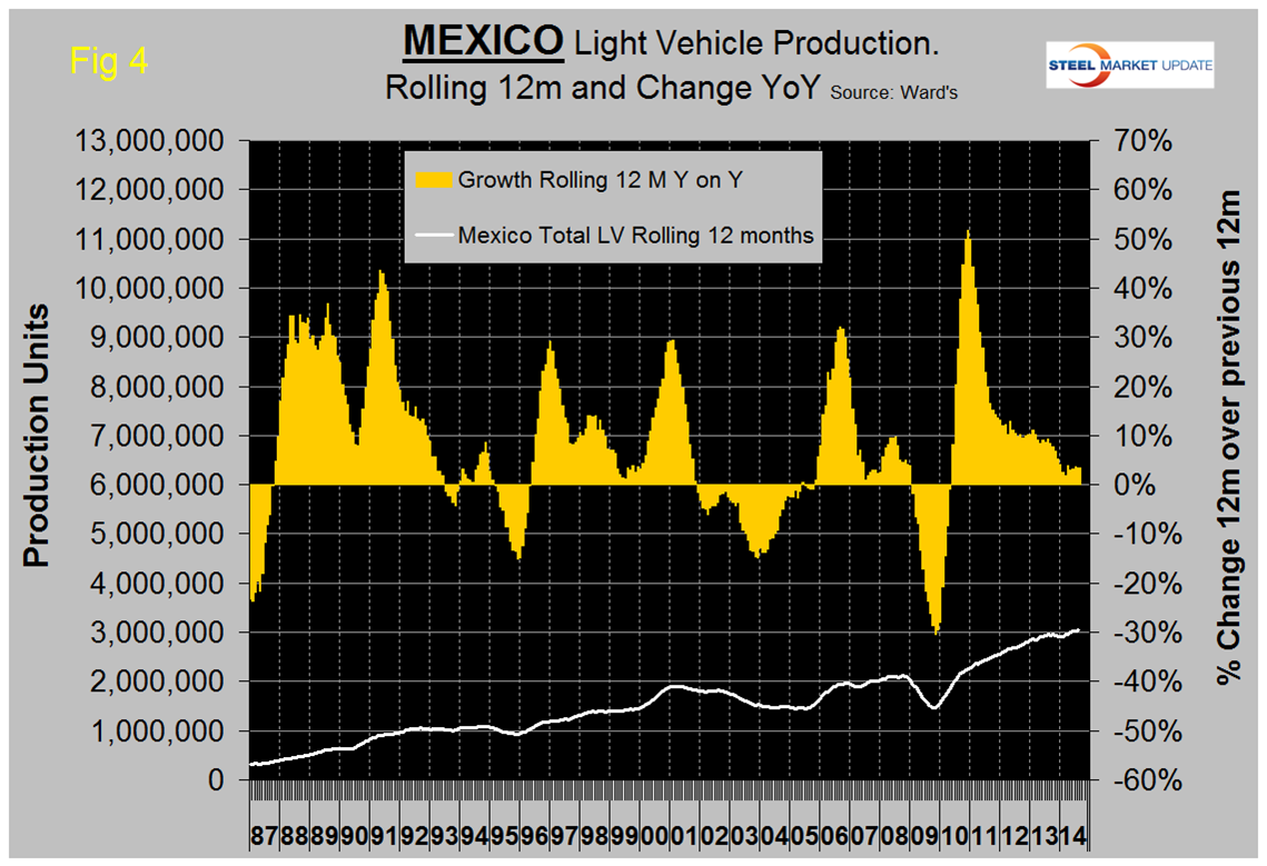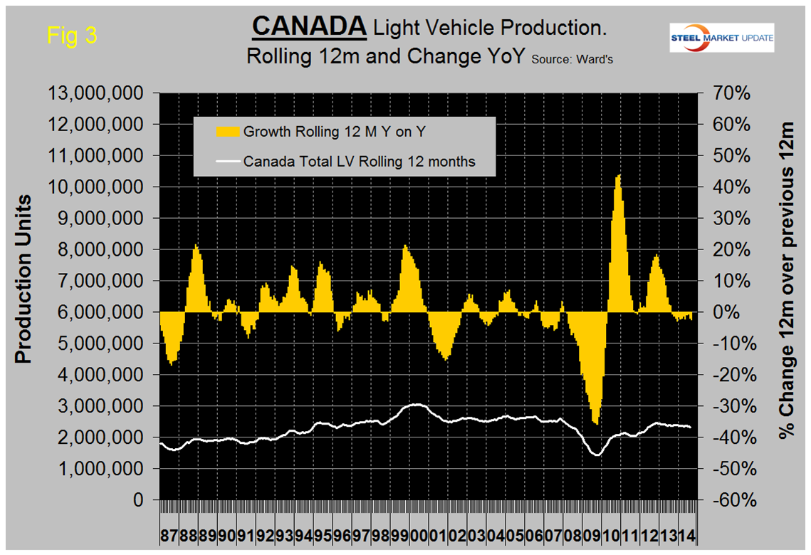 Figure 3 shows the same analysis for Canada. Growth of light vehicle production in Canada has been negative for the last 13 months and has averaged -1.7% in that period. Canadian production is still lower than it was in late 2007. The mix of autos and light trucks in Canada today is almost the same as in the US at 37:63.
