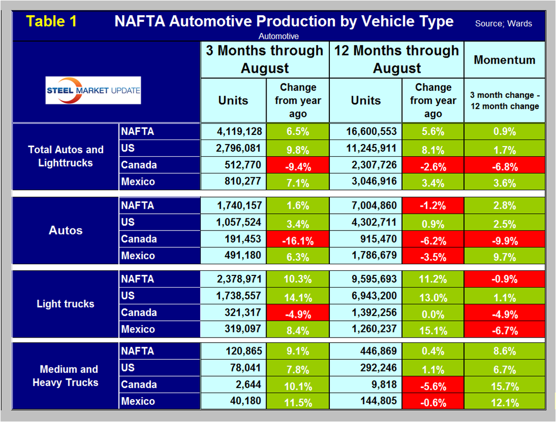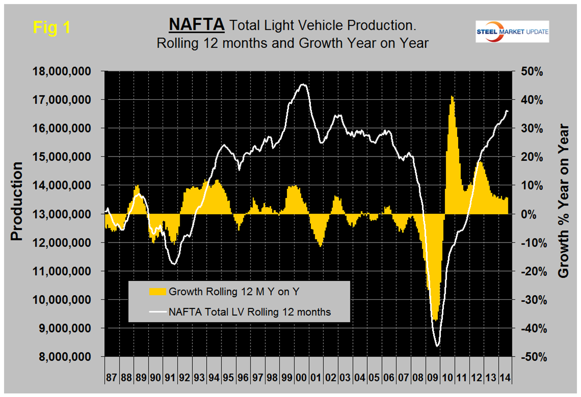 Total light vehicle production in NAFTA in August was at an annual rate of 17,076,936 units, up by 16.0% from July which co-incidentally was down 16.0% from June. This was the normal July re-tooling slowdown. Note: these production numbers are not seasonally adjusted, the sales data reported above are seasonally adjusted. On a rolling 12 months basis y / y light vehicle production in NAFTA increased by 5.6% and is now well above the pre-recession peak, (Fig 1).