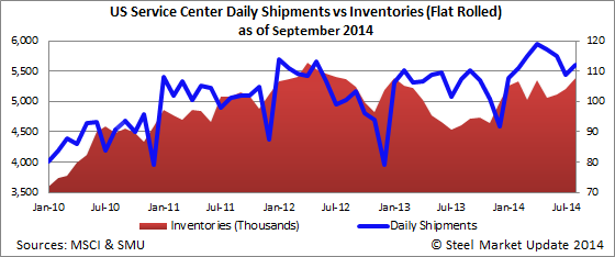 Flat rolled inventories stood at 5,389,300 tons at the end of August. At this level, the domestic service centers are carrying 17.1 percent higher inventories than what we saw one year ago. On a non-seasonally adjusted basis, distributors were carrying 2.3 months of inventory. This is up from 2.2 months in July and well above the 2.0 months one year ago.