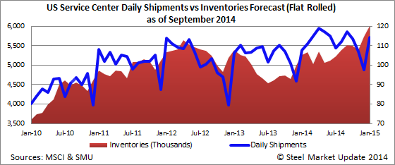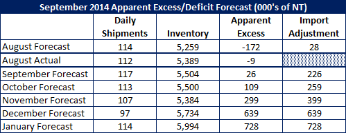 Our new forecast is calculated using September 2013 through January 2014 figures, increasing daily shipments by 6 percent and inventory levels by 5 percent. We estimate that inventories will move further into an excess state throughout 2014. Note that we have added additional foreign tonnage to inventories for September, October and November by 200M, 150M and 100M, respectively. However, we believe there will need to be an inventory adjustment which would come out of domestic tonnages prior to the end of the year lead times (thus we will need to remove our domestic inventory growth levels probably in December). We will watch this carefully in the coming weeks.