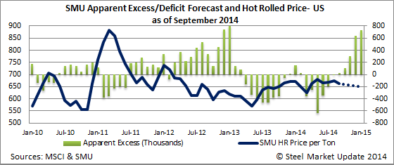 Below is a graphic showing our apparent excess model with a hot rolled price forecast overlay.