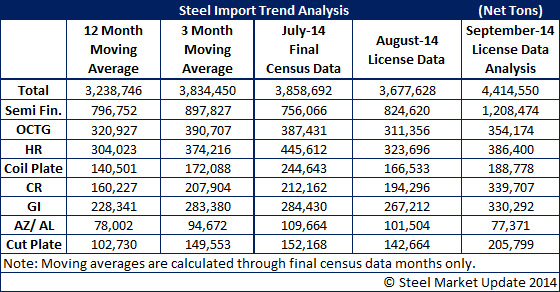 Through the 23rd of September foreign steel import licenses continue to suggest that September imports could exceed the 4.0 million net tons reported in the final census numbers for May 2014.