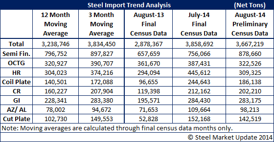 Below is a table by Steel Market Update showing import figures for select products for the months of August 2013, July 2014, and August 2014.