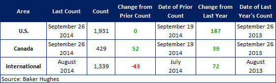 According to Baker Hughes data from September 26th 2014, the U.S rig count for this week is 1,931 rigs exploring for or developing oil or natural gas. This count is unchanged compared to last week, with oil rigs down 9 to 1,592 rigs, gas rigs up 9 to 338 rigs, and miscellaneous rigs unchanged at 1 rig. Compared to last year the 1,931 count is an increase of 187 rigs, with oil rigs up by 230 gas rigs down by 38, and miscellaneous rigs down by 5.