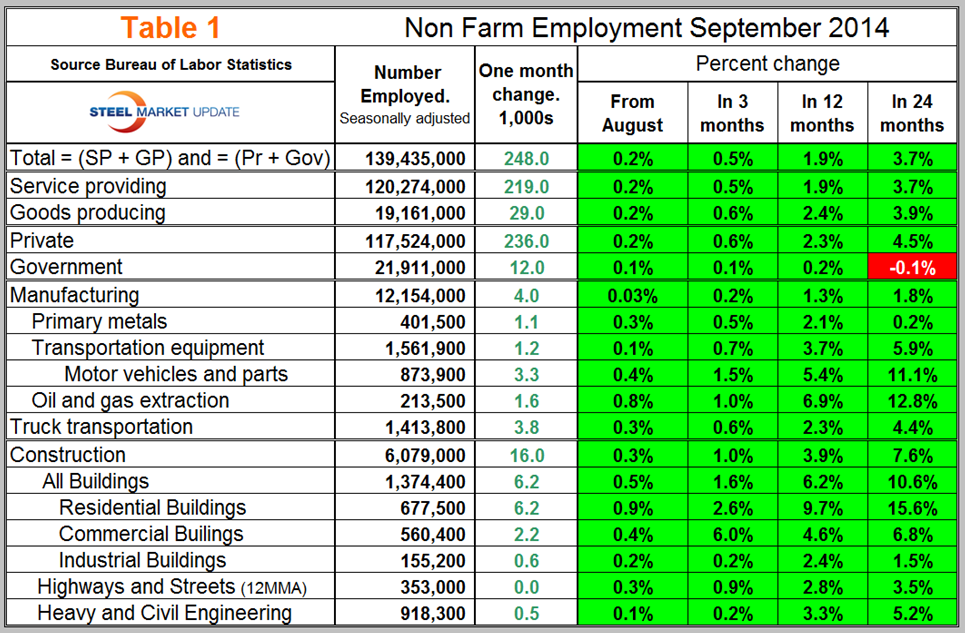 Table 1 slices total employment into service and goods producing industries and then into private and government employees. Total employment equals the sum of private and government employees. It also equals the sum of goods producing and service employees. Most of the goods producing employees work in manufacturing and construction and these sectors are further subdivided in Table 1. In September, private employment grew by 236,000 and government by 12,000. Service industries expanded by 219,000 and goods producing by 29,000 people. Private sector employment has expanded by 4.5 percent in the last 24 months as government has contracted by 0.1 percent. Government employment contracted from September 2009 through January this year but has now had eight straight months of growth. All the growth in government employment has been at the local level. In the first nine months of 2014, the federal government has shed 46,000 jobs, state governments have lost 28,000 and local governments have added 164,000 positions.