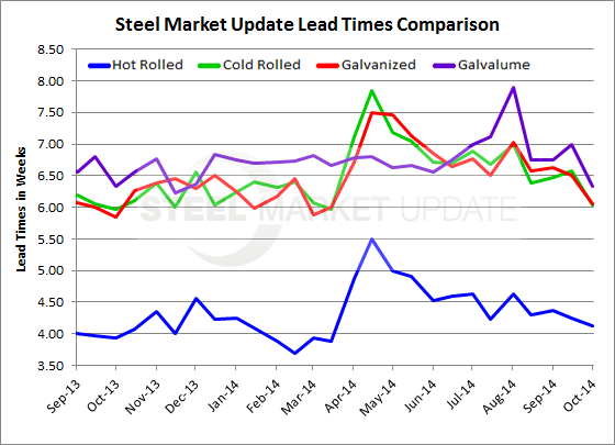 Galvanized lead times also slipped by approximately half a week. The average for this week is 6.05 weeks down from the 6.50 weeks reported in mid-September. Last year lead times on GI were averaging 5.84 weeks. The shortest lead time for the past 12 months was reported on October 1, 2013 at 5.84 weeks while the longest being in mid-April at 7.49 weeks.