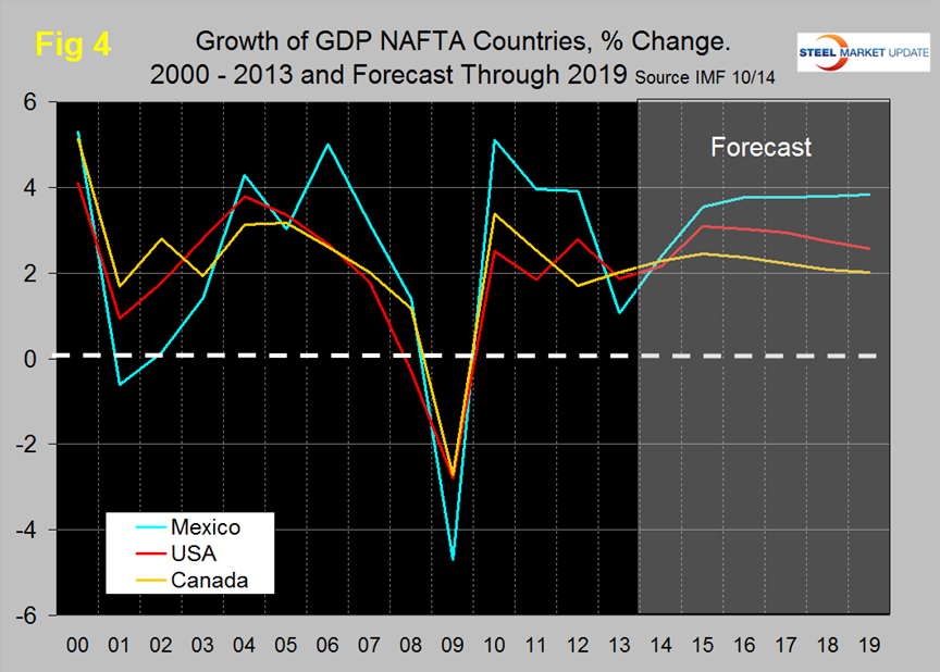 There is a relationship between the growth of GDP and steel demand at both the international and national level which also extends to other commodities such as cement. There are two interesting aspects to this relationship. First the cyclical change in steel demand is vastly more volatile than the change in GDP which we attribute to the inventory response throughout the supply chain. Secondly, as discovered by our friends at “Steel Guru,” is that 1 percent growth in GDP does not result in 1 percent growth in steel demand. At the global level it takes a 2.8 percent increase in GDP to get any increase in steel demand, (Figure 5). This is a long term average over a period of 64 years and based on the added volatility of steel can be a predictor of the immediate future. For example, after the disastrous decline in steel demand in 2009 there was no doubt that a huge cyclical rebound would occur as inventory managers throughout the world began to react to the economic recovery. If the IMF forecast proves to be correct, then the growth in steel demand through 2019 will settle in close to the yellow line in Figure 5 with a growth in steel demand of about 3.5 percent per year. We confess we haven’t yet figured out why the growth of steel and the economy don’t cross at zero but it does appear to be a fact that is born out in our examination of the US steel and cement markets and also by the steel market in Thailand for which we happened to have some data. In the US steel market it requires about 2 percent growth in GDP to generate growth in steel demand, therefore, if current forecasts prove to be correct regarding the US economy, we can expect the steel market to expand through 2019. This recovery in the US should exceed the long term average as construction digs its way out, manufacturing re-shores to the US and the oil boom drives the consumption of OCTG and other steel consumables.