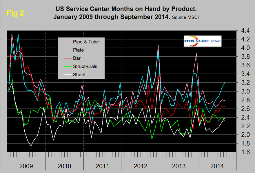 Compared to the end of September last year, moth end inventories were up by 16.3 percent in total, with only pipe and tube experiencing a contraction. Plate was up 25.4 percent and sheet up 19.0 percent. Figure 2 shows the MoH by product since January 2009. Plate and bar inventories have increased markedly in the last five months, sheet was also up significantly in the last four. Sheet products constitute by far the largest segment of service center’s business, have had the best inventory management since 2009, currently only structurals has a lower months on hand.