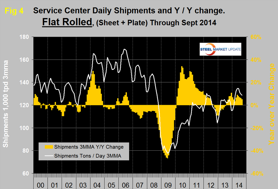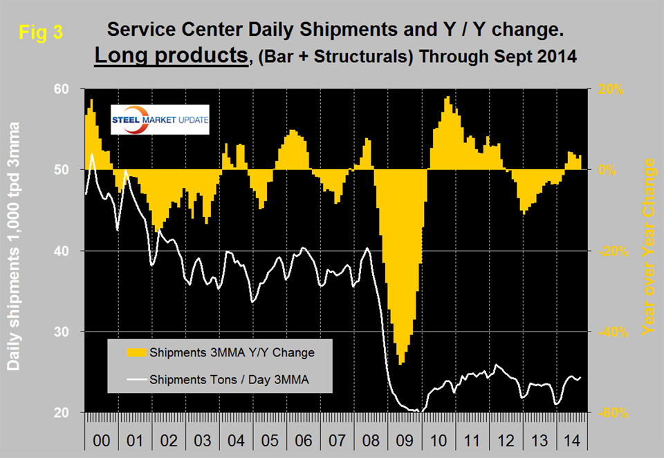 There continues to be a wide difference between the performances of flat rolled, (sheet + plate) and long products, (structurals + bar) at the service center level. Long products have had a very poor recovery from the recession. On a 3MMA basis y / y, the growth of shipments was negative for 21 straight months until April this year which was the first of six straight months of growth, (Figure 3).