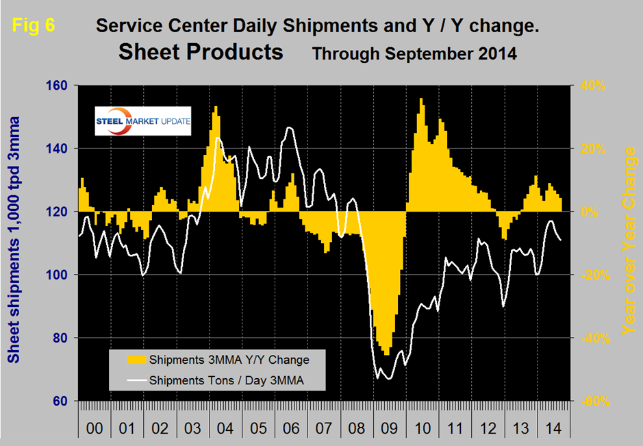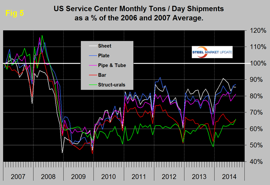 Figure 5 takes the shipments by product since that time frame and indexes them to the average for 2006 and 2007 in order to measure the extent to which service center shipments of each product have recovered. Again it can be seen that bar and structurals have the worst record. Sheet has had the best recovery since the beginning of 2013 but plate caught up in August. Even so the recovery of sheet is only at 85.3 percent and plate at 87.1 percent. The total of carbon steel products is now at 78.5 percent of the shipping rate that existed in 2006 and 2007, with structurals and bar at 65.9 percent and 65.7 percent respectively. The recovery of the service center sector has been much slower than has been experienced by the mills. Presumably this is because more buyers are purchasing mill direct and this is probably particularly true of long products. In addition long products being more construction oriented are suffering from the slow recovery of that business sector.