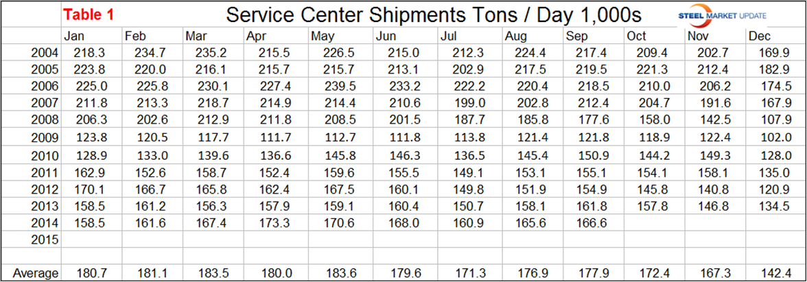 Total service center carbon steel shipments in September increased by 21,100 to 3.498 million tons. Shipping days were unchanged at 21. On a tons per day basis, (t/d) shipments increased from 165,600 tons in August to 166,600 in September. In each of the last four months t/d shipments for each particular month was the best since 2008.