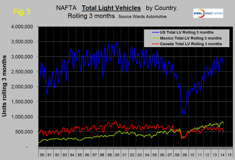 To put the production of the three NAFTA countries into perspective, US output of total light vehicles in the 3rd quarter was 5.3 times that of Canada and 3.6 times that of Mexico, (Figure 3).