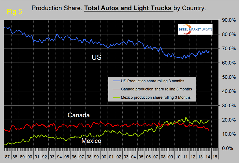 The US production share has been increasing for almost four years at the expense of Canada, Mexico’s share has been virtually unchanged in that time period, (Figure 5).
