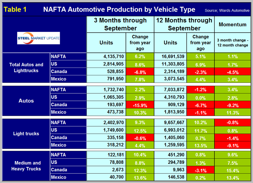 Growth has been solidly in the 5.5 percent range since August last year. On this basis the US is up by 6.9 percent, Canada is down by 2.3 percent and Mexico is up by 4.4 percent, (Table 1). For NAFTA as a whole on a rolling 12 month basis year over year, light truck production is up by 10.2 percent and autos are down by 1.2 percent.