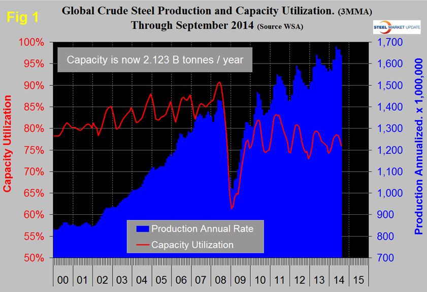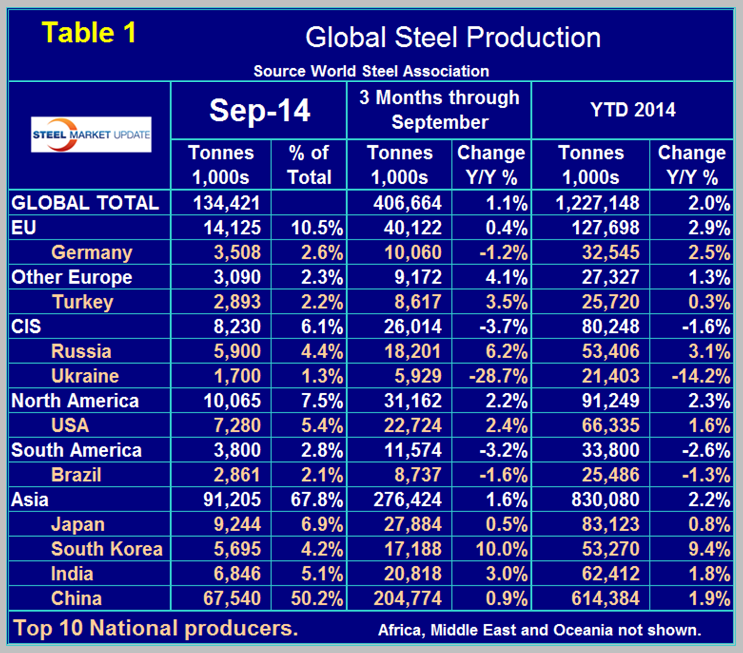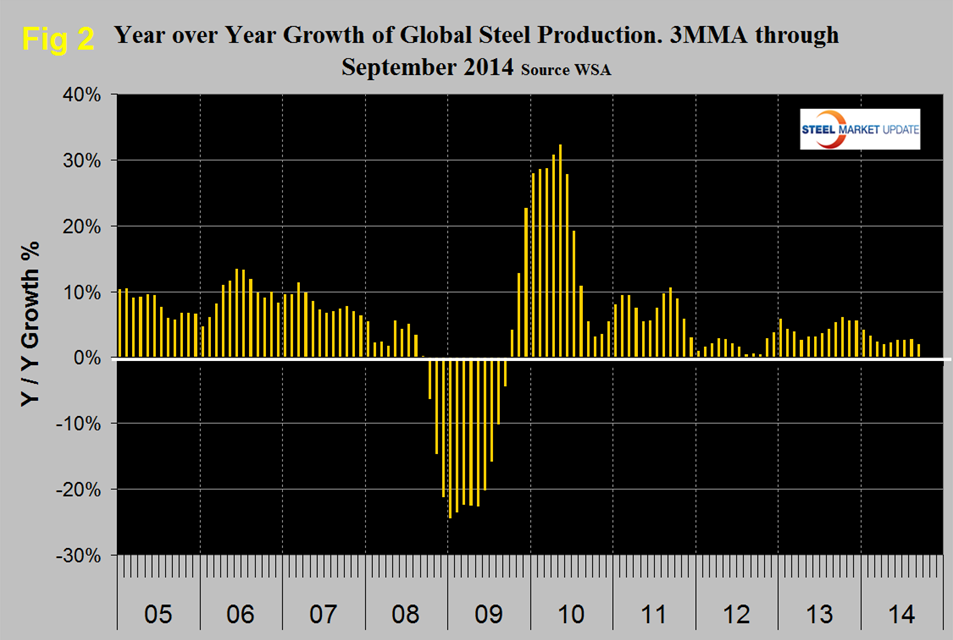 In three months through September, y/y global growth was 1.1 percent, down from 2.8 percent in three months through August. Year to date growth through September was 2.0 percent down from 2.4 percent in YTD through August. All regions except the CIS and South America had positive y/y growth in three months through September. The effect of the war in Ukraine is clear in the contraction of that country’s steel production. The European Union which had the fastest growth rate in early 2014 continued to slow and achieved only 0.4 percent in three months through September. Year over year growth of output in the NAFTA was 2.2 percent in three months through September with the US at 2.4 percent. Canada achieved 7.0 percent and Mexico contracted by 0.8 percent. South America had negative 3.2 percent growth through September with its largest producer, Brazil down by 1.6 percent. Growth in Asian production was 1.6 percent once again led by South Korea at 10.0 percent. In the single month of September, China’s production was exactly the same as September last year, in three months through September China’s production grew by 0.9 percent y/y and YTD was up by 1.9 percent y/y. This may be evidence of the much anticipated slowing in the growth of China’s production. In September China’s share of total global production was 50.2 percent and North America’s was 7.5 percent. Figure 2 shows that the 3MMA of the y/y growth of global production which steadily increased from 2.0 percent in April to 2.8 percent in August, returned to 2.0 percent in September. (Source: World Steel Association.)