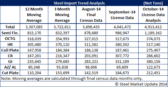 The following is our October analysis of the flat rolled and OCTG imports based on license data through October 21, 2014. As we have mentioned many times, license data is not exact and many times can lead one to over or under project final steel import numbers. We have seen license data for the first three weeks of this month at very high levels which leads us to believe imports could very well match the September 4.0 million net tons.