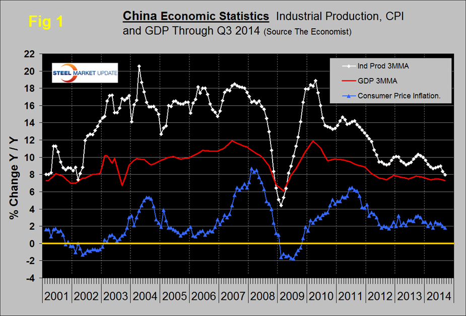Figure 1 shows published data for the growth of GDP, industrial production and consumer prices through the Q3 of 2014. The GDP and industrial production portions of this graph are three month moving averages. GDP grew 7.3 percent y/y in the third quarter and has been declining since Q1 2010. An increasing number of analysts are now beginning to state publicly that they don’t believe the official economic statistics and the GDP growth is more likely in the 4 percent range. The growth of industrial production year over year increased in September to 8.0 percent from 6.9 percent in August but the three month moving average shown in Figure 1 continued to decline.